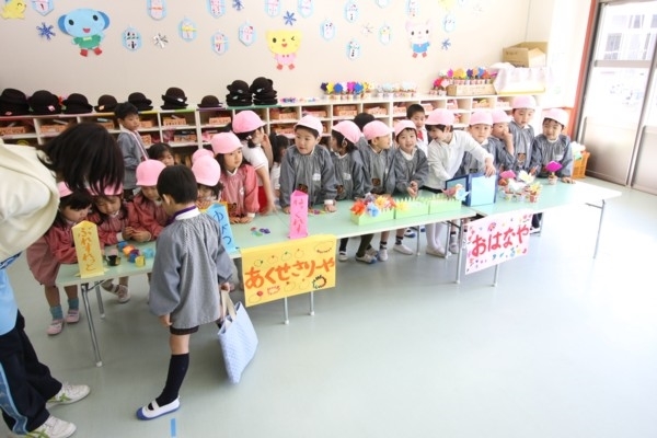 また、年中さんの「お店屋さんごっこ」が、2月18日(火)、19日(水)の二日にわたってホールで行われました。「いらっしゃいませー」「これ、いかがですか」「お買い得ですよ」の元気な声が、「おもちゃやさん」「おはなやさん」「アクセサリーやさん」「おかしやさん」「ペットショップ」「レストラン」から飛び交う中、招待された満3歳児クラスのぺんぎん組さん、年少組さん、ふたば教室及びわかば教室のお友だちが、魅力的なたくさんの品物を前に大喜び。どれも、豊かな想像力とこれまで身に付けてきた力をフルに発揮して作られた創意工夫溢れる品物ばかり。温かく迎えてくれる年中さんとお買い物のやり取りをする子どもたちの、この一年の成長が感じられる、嬉しい一時となりました。