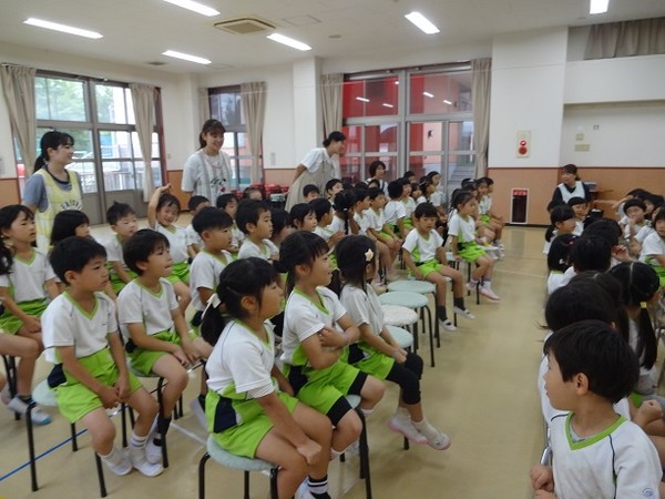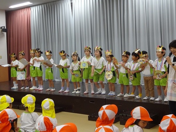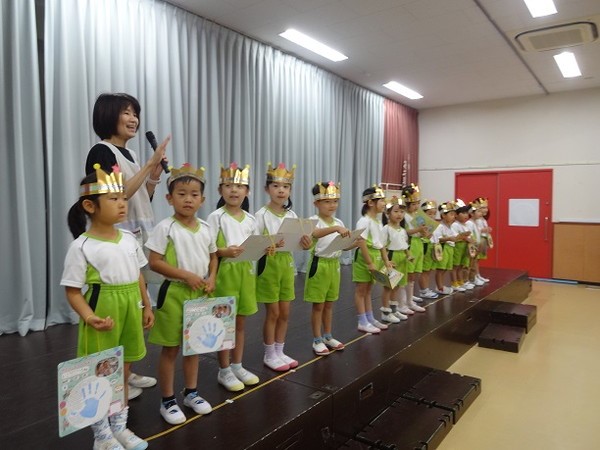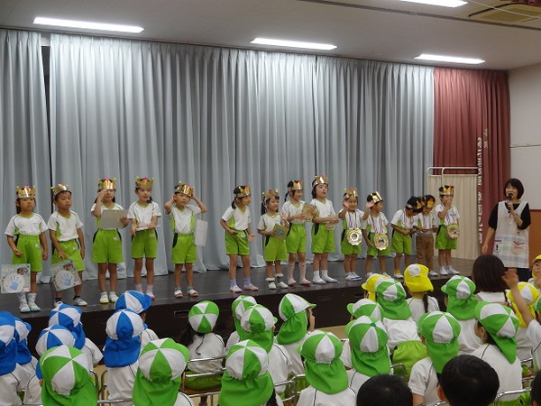 ホールに全学年の全園児が集まって、1学期の終業式が行われました。