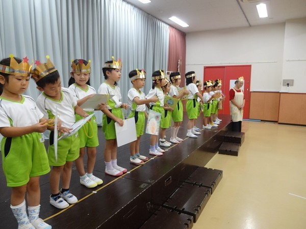 大きな拍手と「おめでとう」の言葉が飛び交う中、7月のお誕生日のお友だちが、頭に冠を付けて元気にステージに上がってきました。何となく照れくさそうにしながらも、嬉しさに笑顔を輝かせる7月生まれのお友だち。年中・少・ぺんぎん組さんから歌「おばけなんてないさ」を、年長さんからは「やっほっほ なつやすみ」の歌をプレゼントされました。そして、先生方からは、三角・丸・四角を組み合わせて何ができる?と言ったゲーム「タングラム」をプレゼント!ホールのみんなが一つになって盛り上がった一時でした。今月のおやつは「シューアイス」。お部屋に戻ってニコニコでいただきました。
