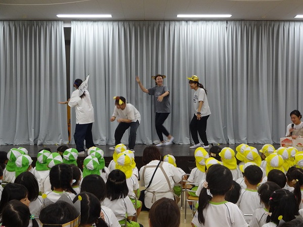 今回の観劇は人形劇。劇団「パンタルカ」さんに、「おおきなかぶ」と「3びきのくま」の人形劇を見せて頂きました。細かい部分まで動きや表情までもが絶妙な動きを見せてくれて、その動きを思わず真似しながら楽しく鑑賞できた園児たちでした。