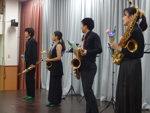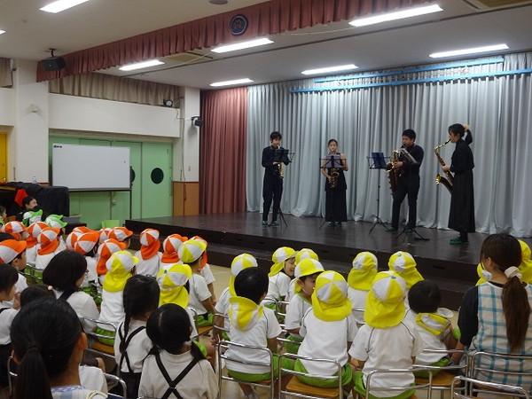 全園児で「開園24周年記念式」をホールで行いました。園舎・園庭の端から端まで響き渡る「おめでとう!」の声に、子どもたちの幼稚園を大切にしようと言った気持ちがいっぱい込められていました。今年は、園章の成り立ちについてわかりやすく説明してもらい、いろいろなところに園章のマークがあることに改めて気がついた子どもたちでした。開園を記念して、サクソフォン四重奏を披露してくださった「イオレサクスフォンカルテット」の皆様には、子どもたちのよく耳にする楽曲を、豊かな響きとリズミカルな演奏で楽しませていただき、豊かな時間を過ごすことができました。そして、お礼にと年中さんが心を込めて作った花束を、素敵な笑顔で受け取ってくださいました。